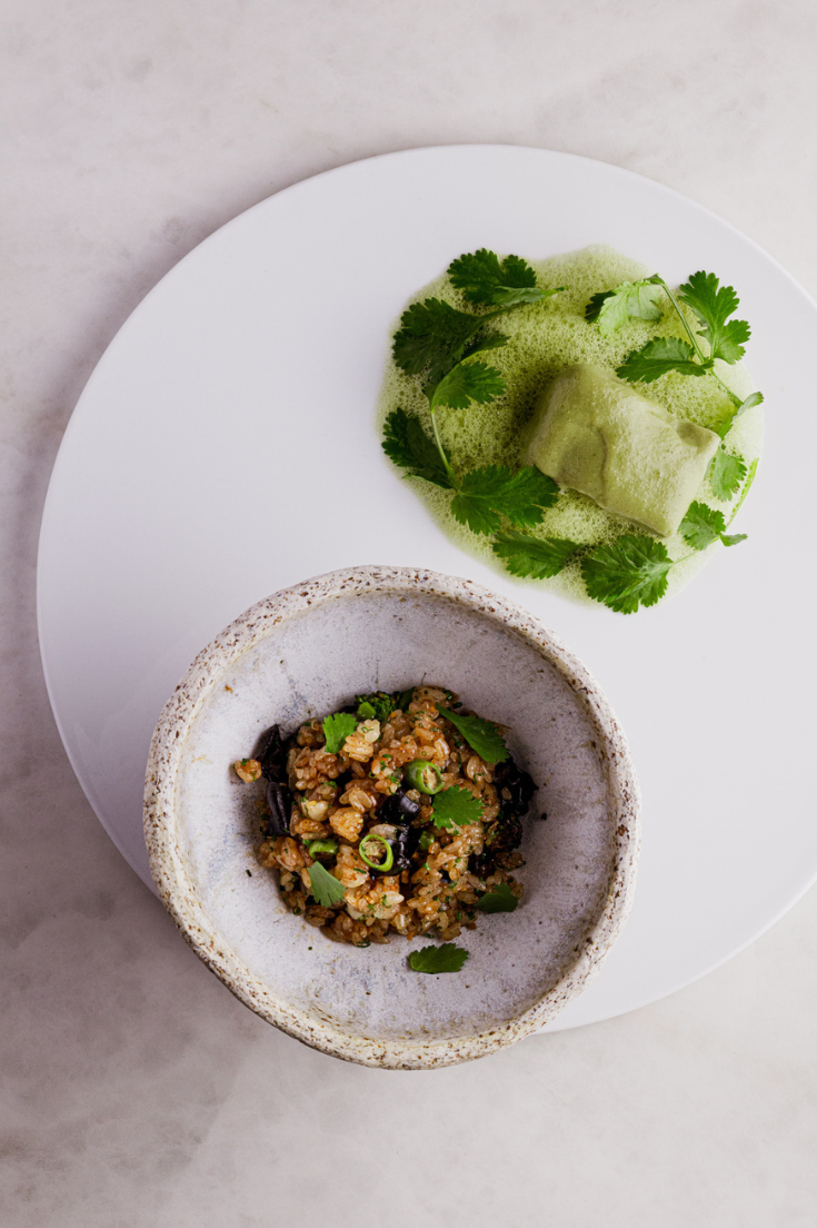 Mini bakłażan tajski, baby pack choi, marchewka baby, szparagi zielone, olej sezamowy, sos sojowy o obniżonej zawartości soli, sok z limonki, świeży imbir, czosnek, mikroliście kolendry, plasterki limonki, żółta pasta curry, mleko kokosowe, olej kokosowy, kurkuma.